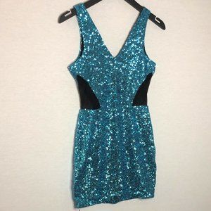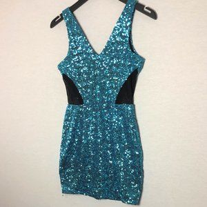 BEBE Turquoise Blue Sequin Dress with Mesh Side Detailing