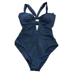Stylish one-piece swimsuit. Features unique cut-out design. Comfortable and chic.