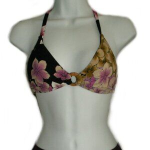 String top by BECCA is lined, no padding, great floral pattern with decorative wood ring at bust, textured fabric.