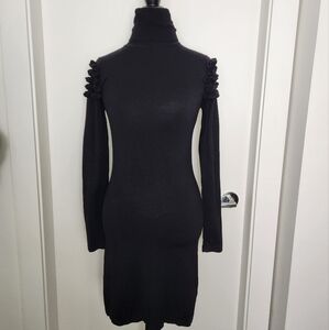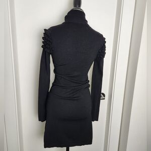 Black Ribbed Knit Long Sleeve Sweater Dress with High Neck and Layered Ruffle Shoulder detail, by Bedo Femme.