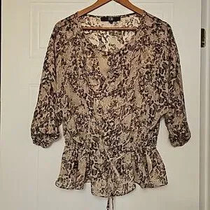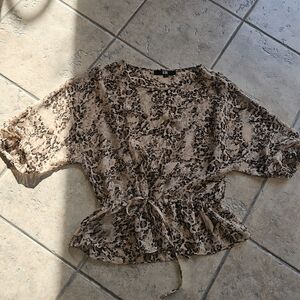 Brand Bedo Size S Leopard blouse 100% polyester Ties at the waist Sheer, flowy, lightweight Puffy sleeves Preowned very good condition No flaws to report.