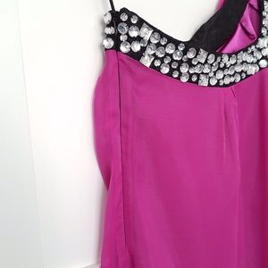 Fuchsia pink dress with large gems all around, hidden side zipper for flawless look. Lightly worn with tiny snag on lower back area, barely noticeable.