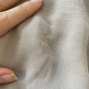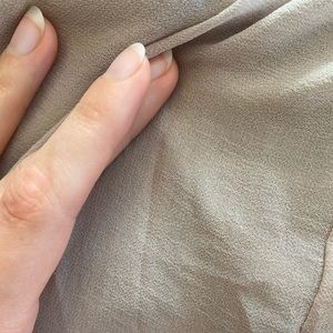 Crepe style fabric, beige romper. Loose thread in front and slight mark on right upper thigh, very unnoticeable (barely shows up in photo). Can be dressed up!