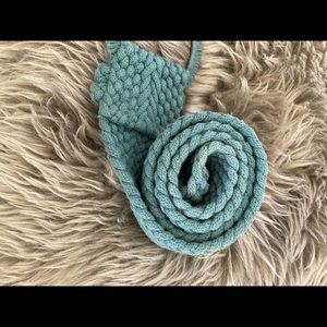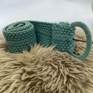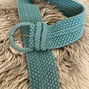 Woven belt in a dark turquoise blue. Purchased in Belgium from American Outfitters. Wore it once and it has been sitting around my closet for 14 years. It’s a cool piece. I believe it’s made of cotton. It’s thick. It’s adjustable and a statement piece. Paid 95 euros. Price will reflect the age of it! Would look great with a white prairie dress or jean dress. ❤️