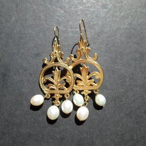 BEN-AMUN Vintage Dangle/Drop Fleur de Lys Earrings Gold Tone Pearl Dangles