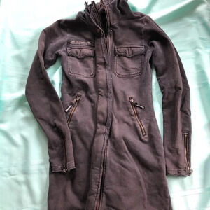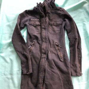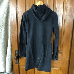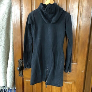 Black long zip up sweater. Has zippered accents on the back at the bottom and on the sleeves. Also has thumb holes. Very comfy and great length for winter! Size XS. Good pre loved condition no issues to note.