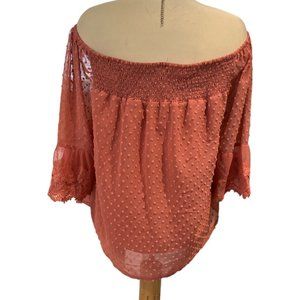 BEQUEMER LADEN Off Shoulder Top Sz XL Smocking Lined Beautiful Sheer Sleeves