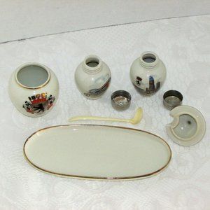 Overall the set is in very good vintage condition. No chips or cracks, minor wear to graphics and gold trim. One shaker has crazing. Spoon slightly discolored. White spots are reflections of the flash.