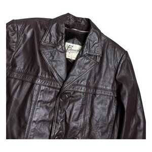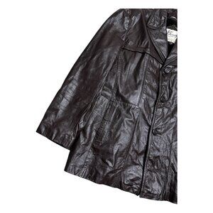 Crafted from high-quality leather and featuring a versatile button closure, this coat is designed for both durability and ease of wear. The coat comes in a men's size large, with a regular fit that accommodates layering. Practicality meets vintage charm as this Bermans coat, with its pocket features and durable construction, carries you through time with a nod to the style of the 80s and 90s.