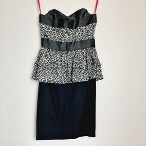 • Sleeveless, strapless peplum style dress color-blocked in black and cheetah/ snow leopard print . Back zipper closure, ruffled skirt part and boning in the corset / top portion. Fully lined.