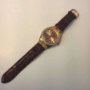 Rose Gold Tone metal Face, Crystal Bezel has all stones, and Brown/Genuine Leather Straps featuring buckle closure