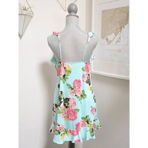 The perfect summer dress with a deep ruffled V neck and ruffled hem. Hits above the knee. Bright pink floral print all over a light sky blue.