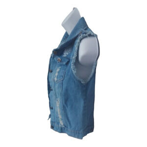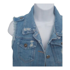 Denim blue jean jacket. Button closures on front and pockets. Sleeveless. Distressing and fraying on the back and on the front.