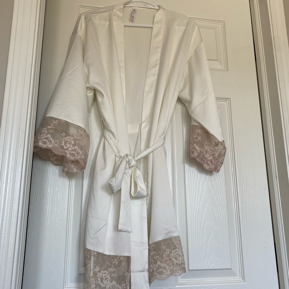 Flora Nikrooz bridal robe from BHLDN. Style Rosa Charmeuse in ivory rose. Has champagne/light pink rose lace detailing. Size large. Worn once and been hung up ever since. Super soft and very cute, still in new condition. No staining or pilling. I usually wear mediums, for size reference!