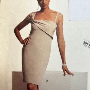 Closee fitting, straight or slightly tapered dress, above mid-knee or evening length, has shoulder straps, pleated, bias front/back/shoulder (attached) drapes, stays and side zipper