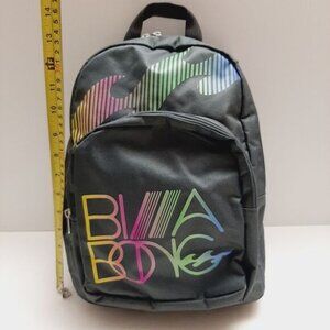• Small backpack in grey with colorful yellow, pink, blue and green decal and adjustable straps.