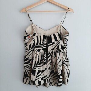 • Sleeveless lingerie style, tank top in creamy white and black tropical leaf print with adjustable straps and back zipper closure.