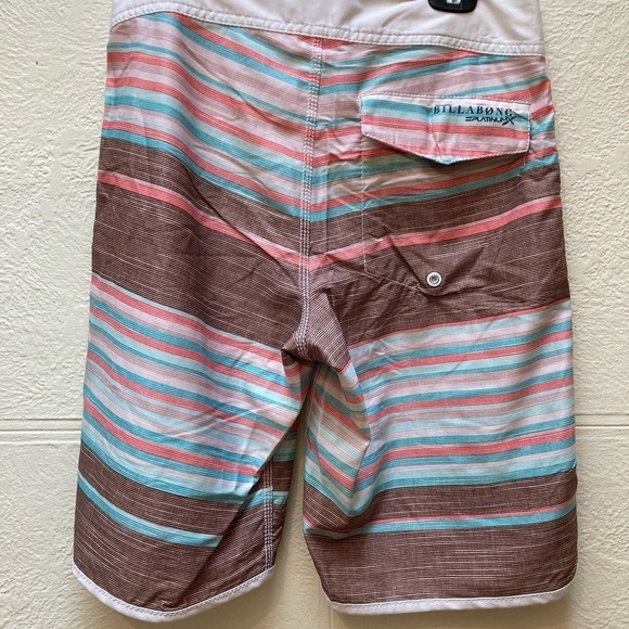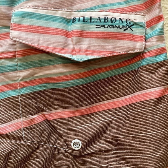 Billabong striped board shorts with Velcro fastener and tie at waist. Good pre loved condition. One visible flaw is that some of the stitching has come off the back pocket. Size 28 waist.