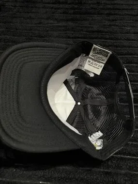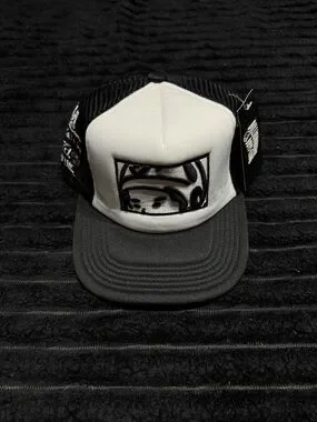 Billionaire Boys Club trucker cap. Black crown and brim with white front panel. Breathable mesh back and adjustable snap closure. Icon label on interior. Clean, streetwear style.