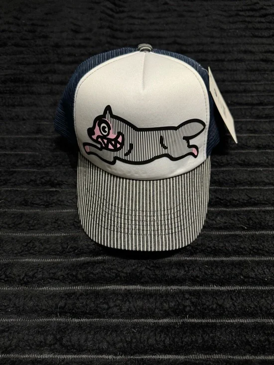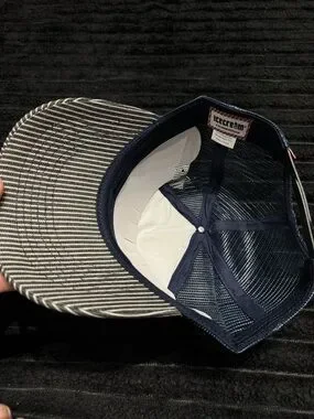 Trucker hat with a playful striped cat graphic on front. White front panel with navy mesh back. Patterned striped bill adds contrast. Casual, fun accessory. Adjustable fit with tag attached.