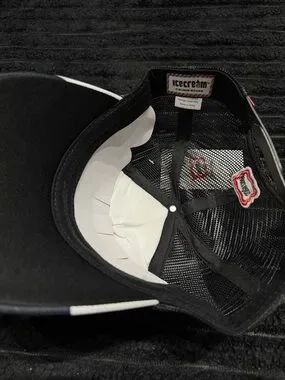 Graphic trucker hat with a bold red cartoon cat on the front. Black mesh back and black brim with white wave detail. Casual, playful design. Great statement accessory.