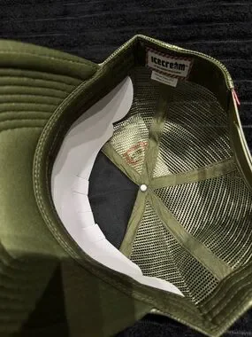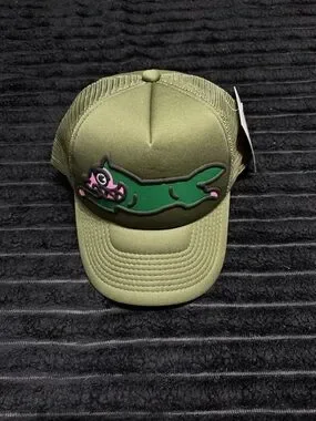 Olive green Icecream trucker hat with a raised creature patch. Mesh back provides airflow. Snapback closure for adjustable fit. Fun patch adds bold character.