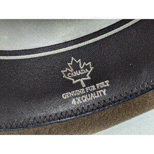 A sturdy hard felted hat, marked on the inside lining BILTMORE Wilderness collection, and on the leather head band "Made in Canada, genuine leather", "Genuine Fur Felt 4x quality", "I LOVE HATS Vancouver, BC". The sizing tag marks this hat 57 or 7 1/8. A great hat for summer, the wide brim offers great sun protection.