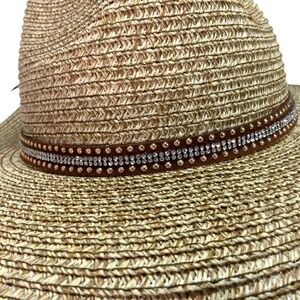 BINDYA Woven Straw Lulla Collection Panama Hat Rhinestone / Stud / Leather Band