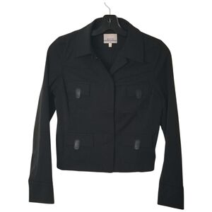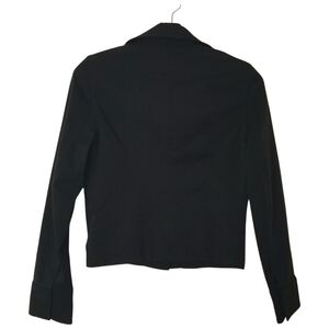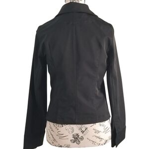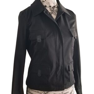 Fitted black jacket from French boutique label Biscote, rare “Vodka” model. Stretchy and structured with 4 functional flap pockets and a soft, crisp silhouette. Slight sheen. Unlined. Zip front hidden by tab placket. Polyamide blend.