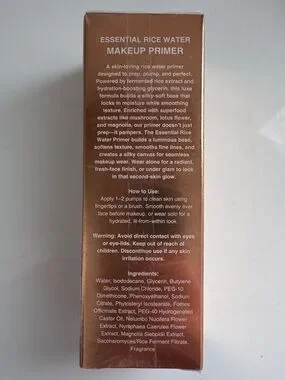 •A skin-loving rice water primer designed to prep, plump, and perfect. Powered by fermented rice extract and hydration-boosting glycerin, this luxe formula builds a silky-soft base that locks in moisture while smoothing texture. Enriched with superfood extracts like mushroom, lotus flower, and magnolia, our primer doesn't just prep—it pampers.