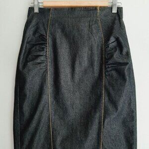 • Midi length, high waist pencil skirt in blue denim with front ruching details, contrasting stitching, back slit and back zip closure.