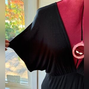 Light and comfortable jersey dress with elasticized empire waist and deep v neckline. Short, batwing style sleeves. The perfect LBD for warmer weather. Would also make an incredible beach cover up. Labeled XS but fits more like a S - M imo and listed accordingly. GUC