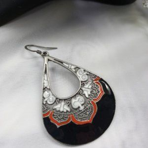 BLACK ENAMEL EARRINGS, PEIRCED EARS, DANGLE DROP EMBOSSED DESIGN RED, WHITE 5CM