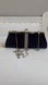 Black fabric accordion pleated even bag with silver metal frame, chain link removable strap & kiss clasp top closure. The bag easily converts to a clutch & has a fabric interior with a pouch for storage. The feature of the bag is the strip of rhinestone on the front of the bag adding the perfect amount of glamour.