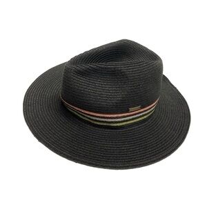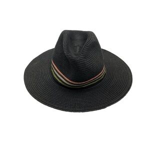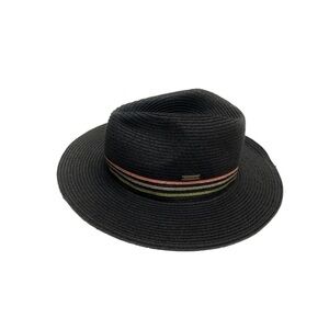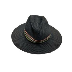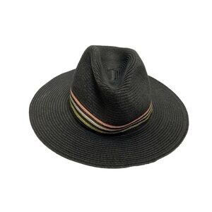 Black Fedora paper straw hat with contrasting stripes on the crown, floppy brim and dimple crown. Wide brinm. 100% Paper straw. Excellent condition. No Flaws