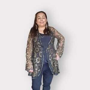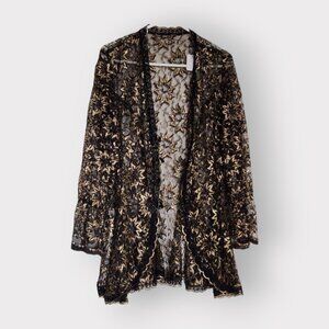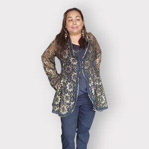 BLACK & GOLD SHINY LACE BLOUSE SIZE L OR XL WITH BELL SLEEVES AND LOOP BUTTON