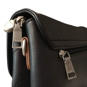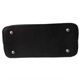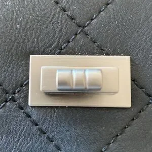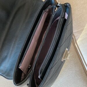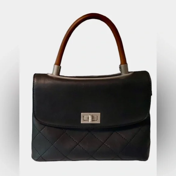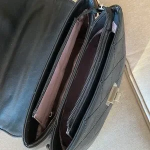 🌸 Black handbag with front quilted stitch and twist turn lock, blush pink interior, inscribed hardware.