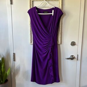 This striking sheath dress in a deep purple hue features a flattering V-neckline and cap sleeves. The ruched wrap design and pleated details at the waist create an elegant silhouette, perfect for a cocktail event or a night out.