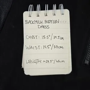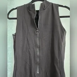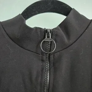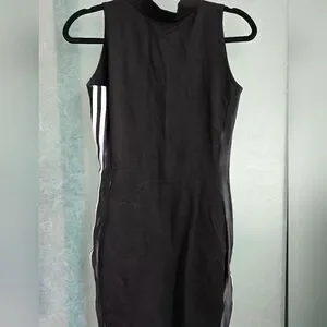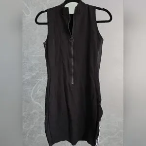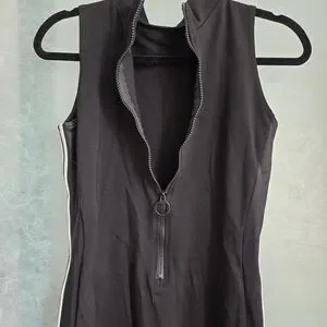 Fun bodycon dress with a high neckline and a sporty look. It is a stretchy body con that really shows your assests. layers well with a long sleeve. It has white racing stripes on the sides that not only accentuate the curves but makes you go faster (User Tested vroom). The white stripes are also matched with a shiny, black satin-like stripe that adds depth to the dress. Hits around mid thigh.
