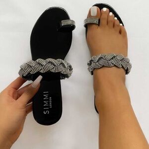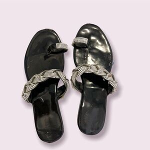 BLACK PATENT DIAMANTE TOE LOOP SANDALS