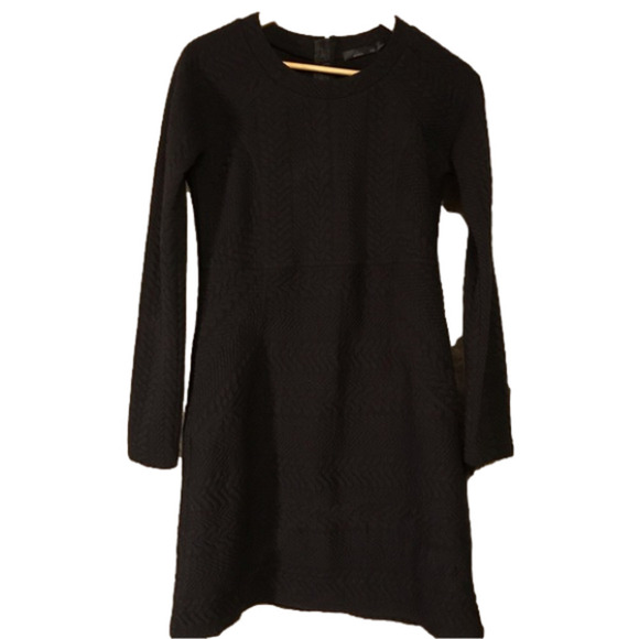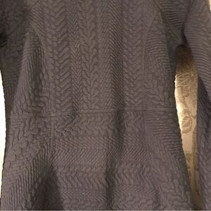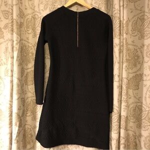 Sweet black dress with gold back zip. Difficult to capture the pattern on the fabric, but it is visible in pic #3. Comfy dress, with a bit of stretch. Excellent condition.
