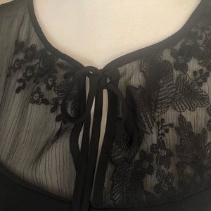 LOOSE FITTING AND LIGHTWEIGHT WITH SEE THROUGH EMBROIDERED BLACK ORGANZA LACE AND TIE-UP FRONT WITH SIDE ZIPPER.
