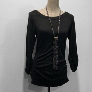 This beautiful black knit sweater by 89th & Madison features 3/4 length sleeves with ruching down the side. More ruching can be found down the sides of the sweater for a figure flattering silhouette. Boat neckline. Available in good preloved condition - light wear.