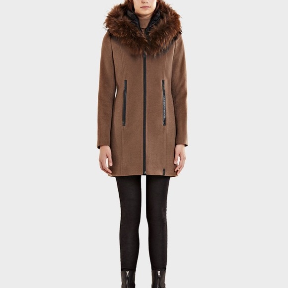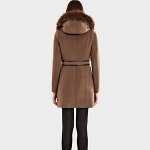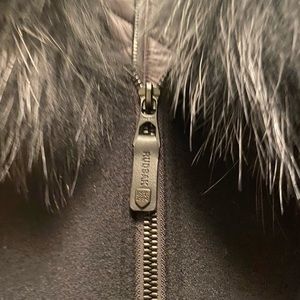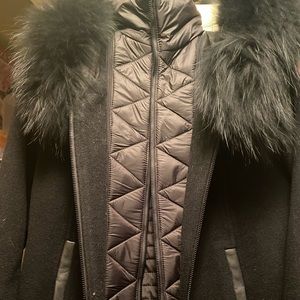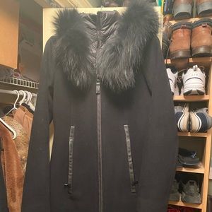 Wool coat with removable nylon front and neck lining. Faux belt and real fur trim on hood. Leather trimmed. Too snug for me so it’s only been worn a couple of times otherwise in perfect condition. Colour is black, other photos for reference only.