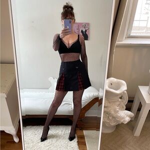 BLACK SKIRT RED PLAID PLEATS INSERTS BACK ZIPPER D RINGS VINTAGE TRACY EVANS