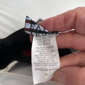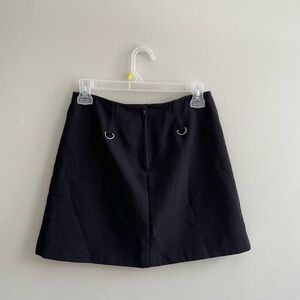 Black skirt with back zipper, silver d rings & red plaid box pleats adding a nice contrast against the black polyester fabric with a bit stretch.