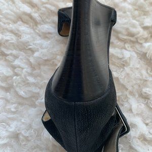 Living now by the "If I haven't worn it in two years time to let someone else." motto. Bought just before COVID, selling a pair of 3" high heel open toe Black Suede Nine West Sandals. Worn only a couple of times inside a smoke free home. There is a small little scuff mark on the left side of the shoe. Took a photo of it but hard to see in the pic, but it is there. Not noticeable from top angle at all. Funky ankle strap. Good condition.