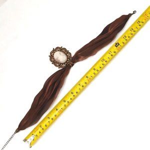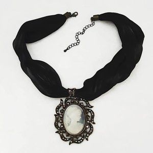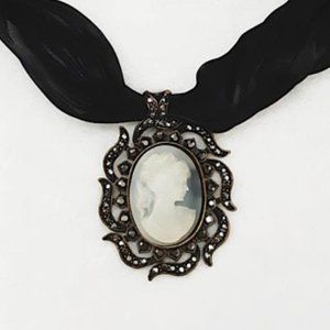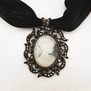 Victorian Style Necklace with BLACK Satin Off-white Carved Cameo Austria Crystals Brass Pendant-Necklace.