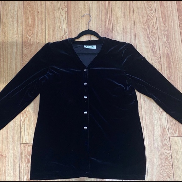 Black Velvet Cardigan With Gold detailed buttons. Vintage find but in good condition, 8/10. Fits women’s size large.