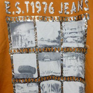 Est 1976 Jeans front design with shiny silver and gold boarders